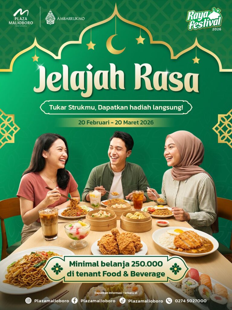 Yogyakarta, 23 Februari 2026 – Dalam rangka memeriahkan bulan suci Ramadan, Plaza Malioboro menghadirkan program “Jelajah Rasa”, sebuah program belanja yang mengajak pengunjung menikmati beragam pilihan kuliner sekaligus mendapatkan hadiah menarik. Program ini menjadi bagian dari komitmen manajemen dalam menghadirkan pengalaman berbelanja yang lebih interaktif, hangat, dan penuh kebersamaan bagi masyarakat Yogyakarta maupun wisatawan.