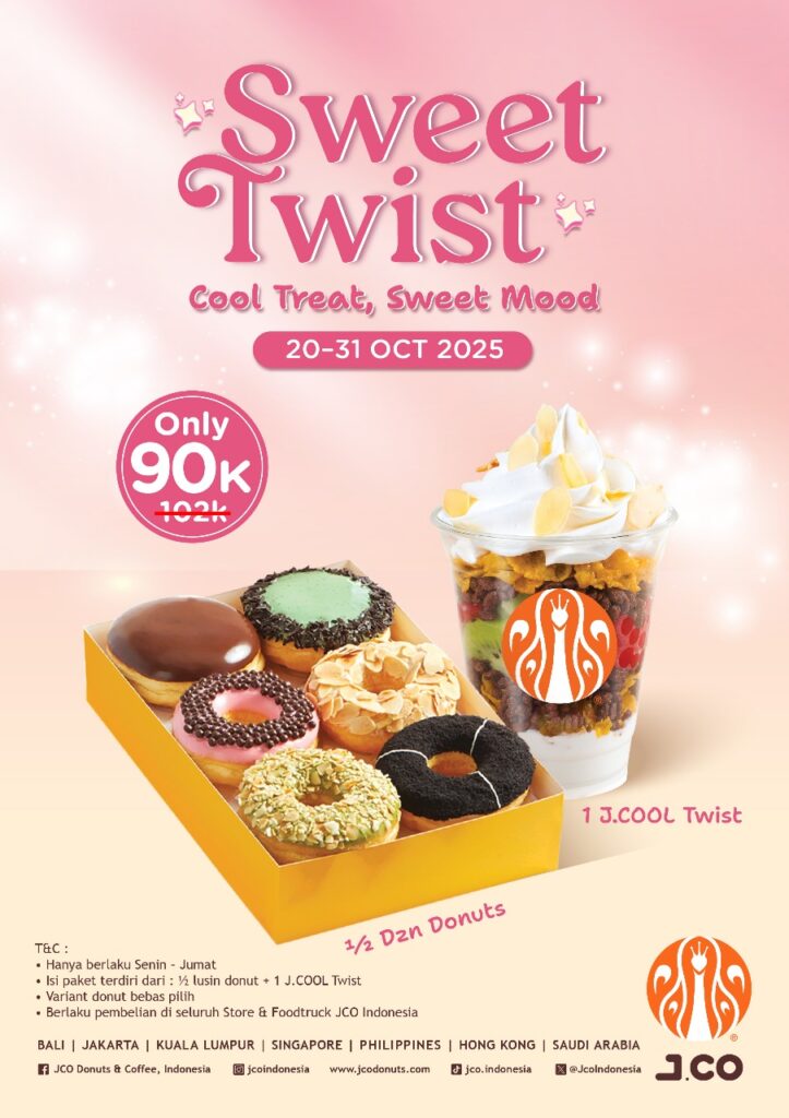 Sweet twist to start your week right! Enjoy ½ Dozen Donuts + 1 Jcool Twist for only 90K — mix your favorite donuts and top your Jcool with 5 delicious toppings!